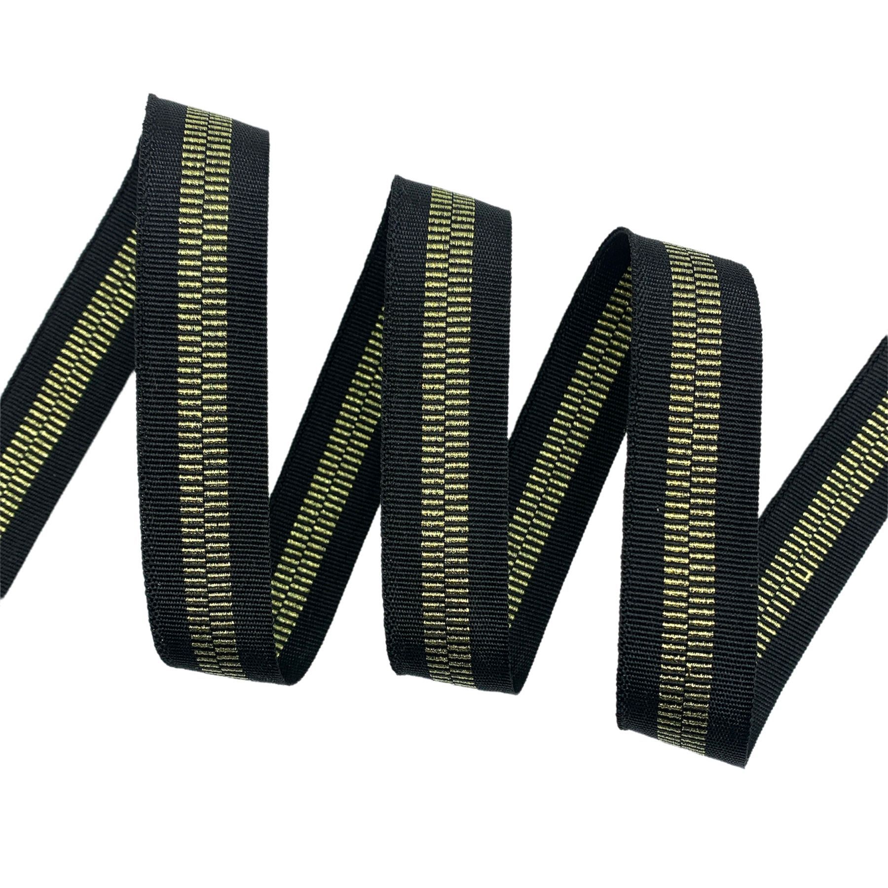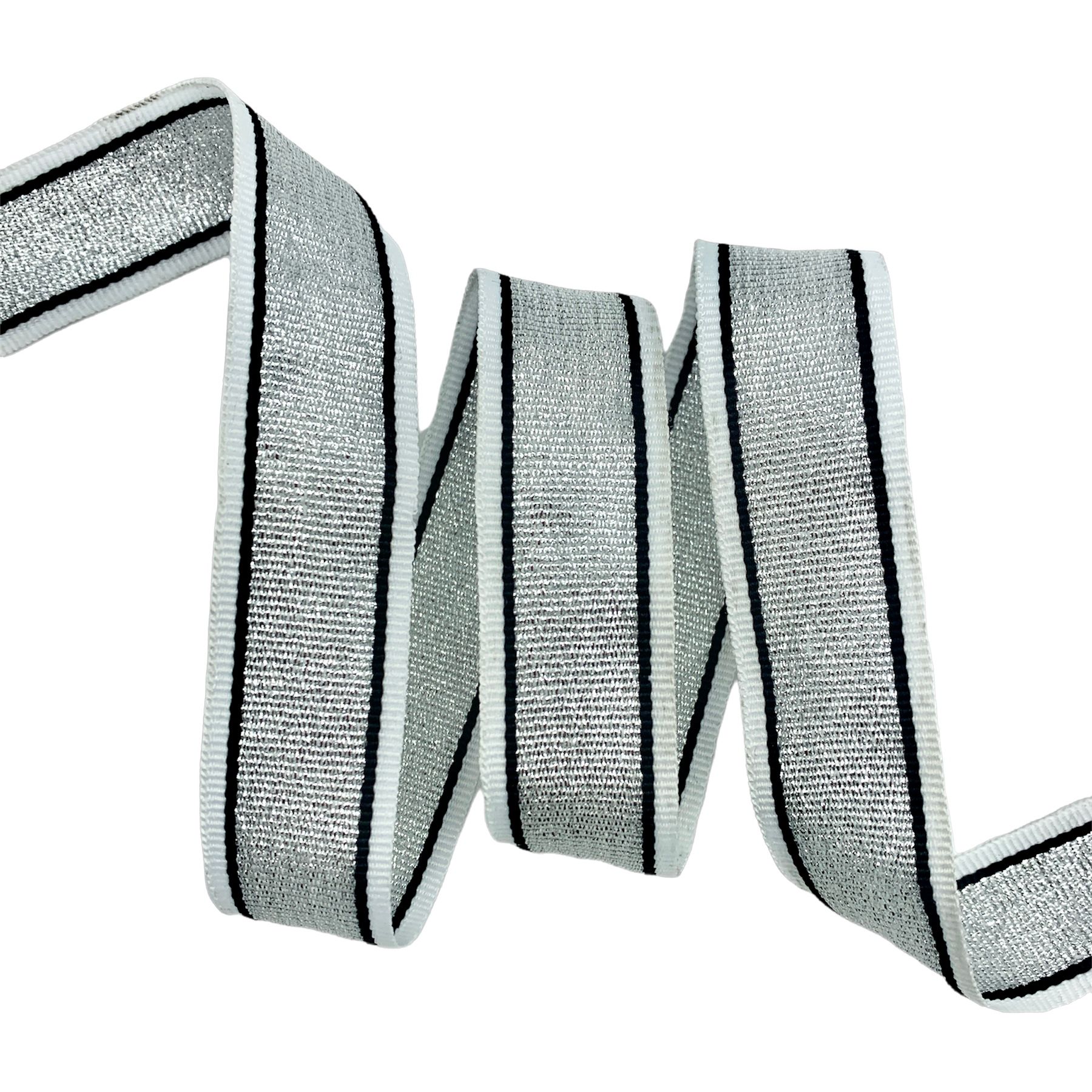 A fita na trama tela gorgurão BICM possui fios de poliéster nas bordas e o fio metalizado na sua faixa central.